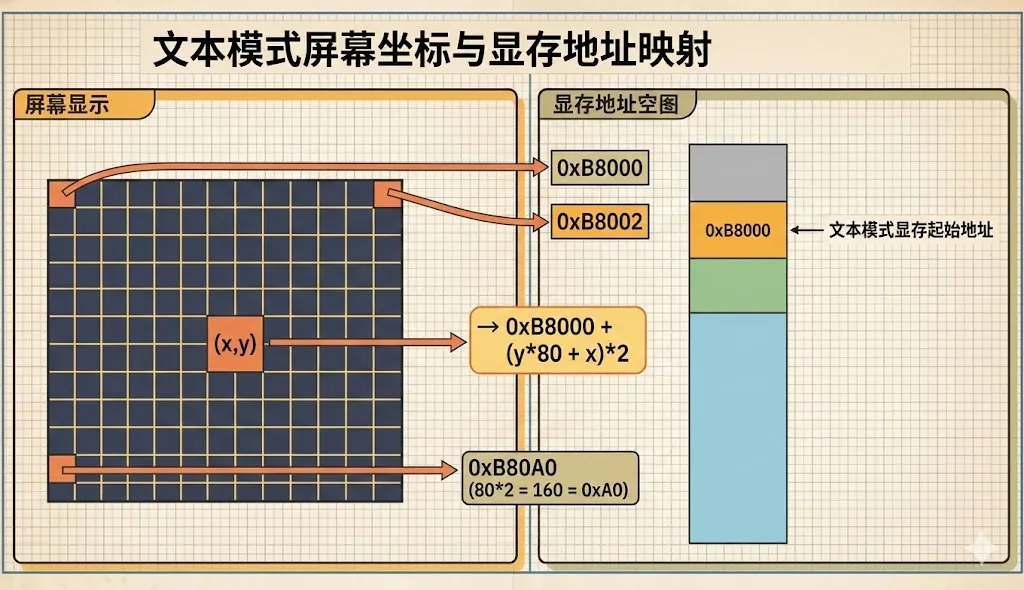 屏幕坐标 (x,y) → 内存地址 0xB8000 + (y*80 + x)*2