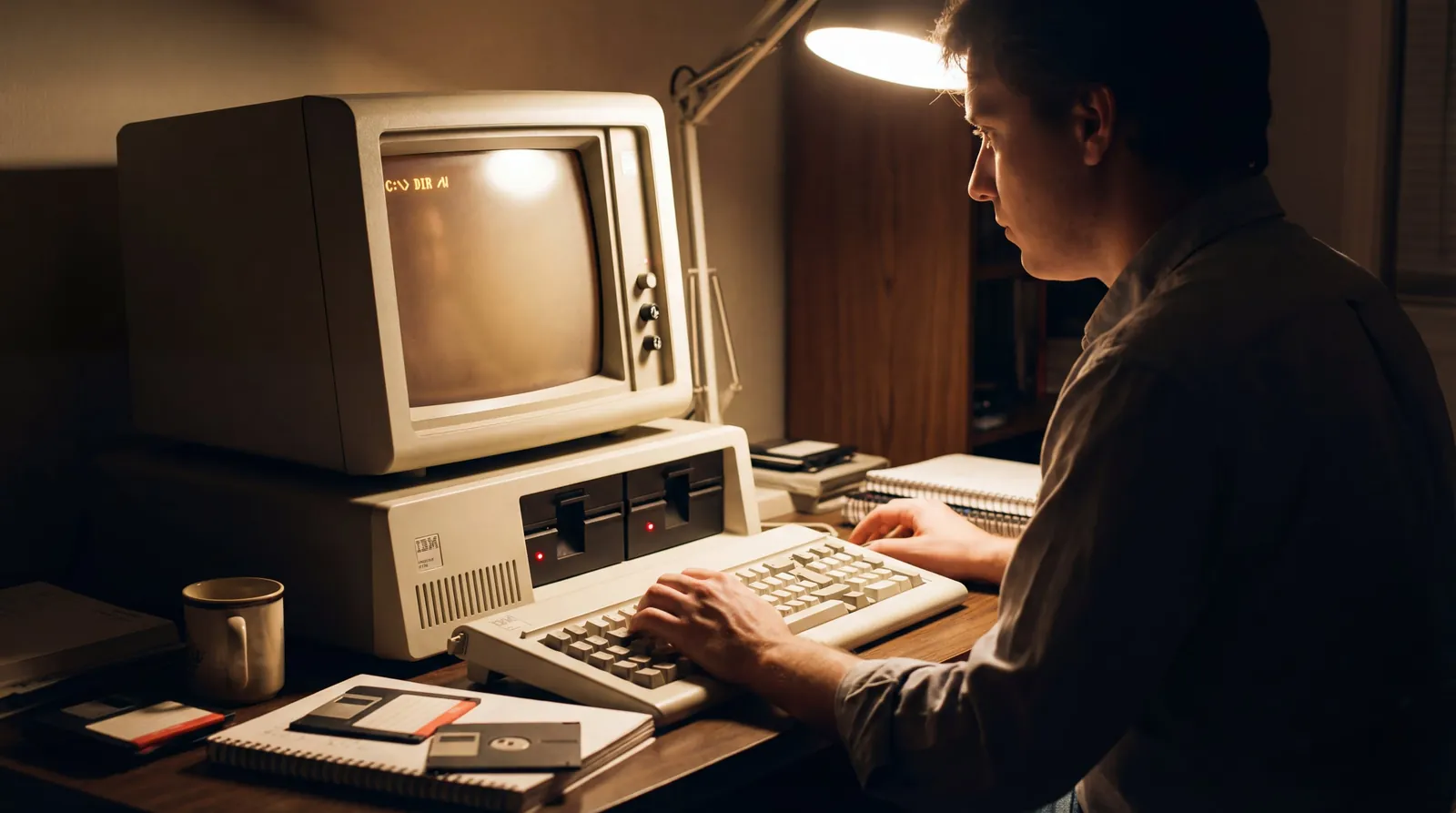 你坐在一台 IBM PC 前。机箱发出低沉的风扇噪音,CRT 显示器散发着微弱的臭氧味道。